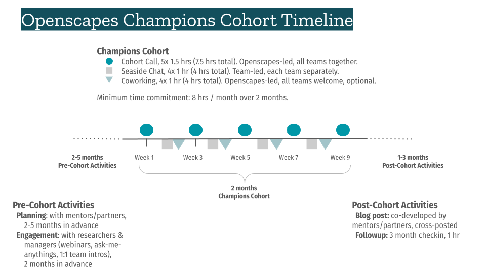 - Expected time commitment: 8hrs/month for 2 months is a minimum expected time commitment. This accounts for 3 hours/month of synchronous Cohort Calls, optional Coworking hours, and team Seaside Chats where you plan with your research group to strengthen shared workflows.